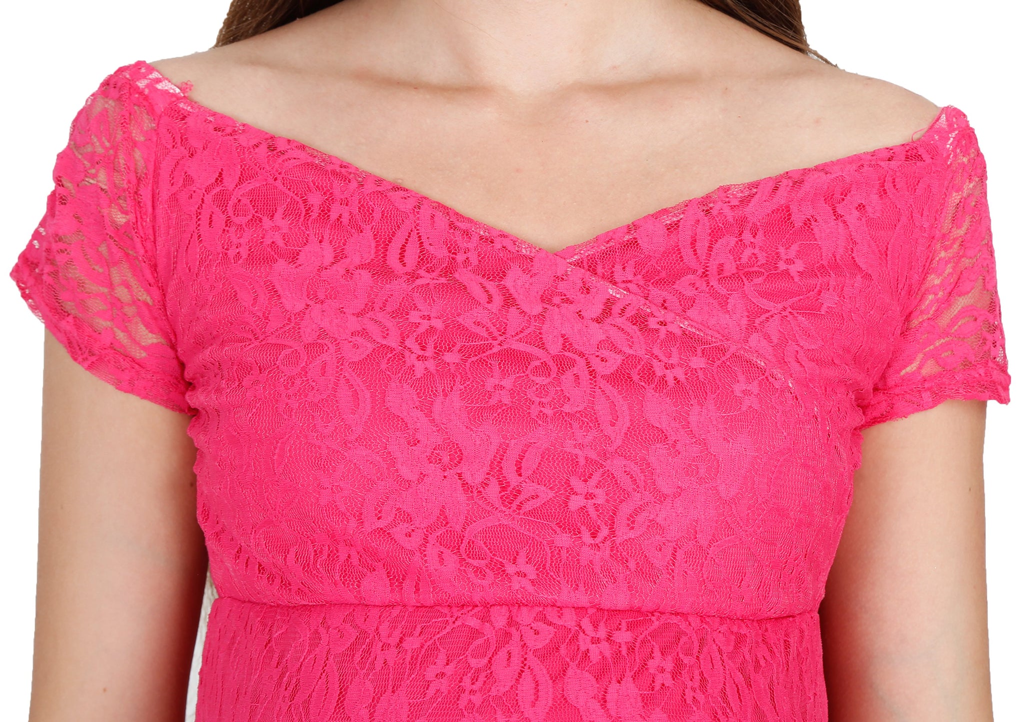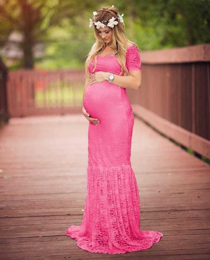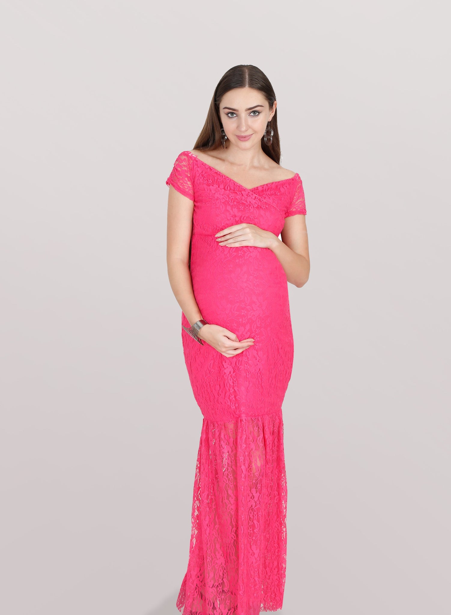 This spring, flaunt your pregnancy with this off-shoulder lovely Hot Pink maternity maxi dress. Perfect for baby shower and pregnancy photoshoot, this dress is made of soft Lace fabric that accentuates your curves, and makes you look elegant and classy. The comfortable fabric supports the belly and adds grace to the overall look. This dress will add to your radiance and pregnancy glow and is long so that it gives a trail effect!