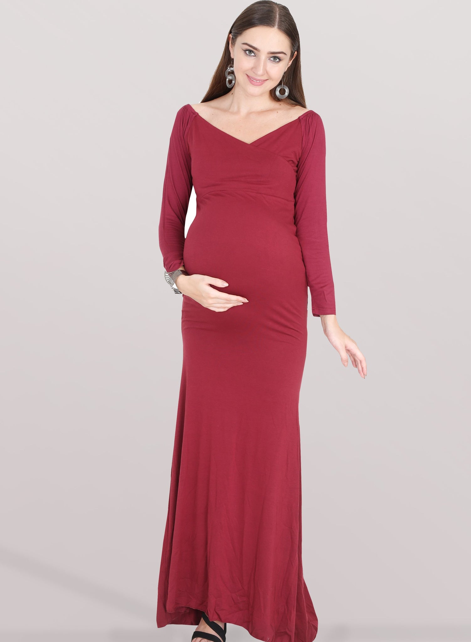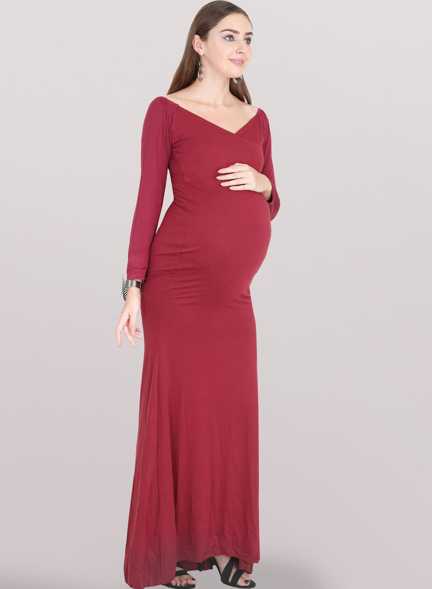 This long sleeved Maroon maternity dress is a smart outfit for your maternity photoshoot, baby shower or an evening dinner. The elegance of the dress will enhance your curves while the soft stretchable material will keep you at ease.