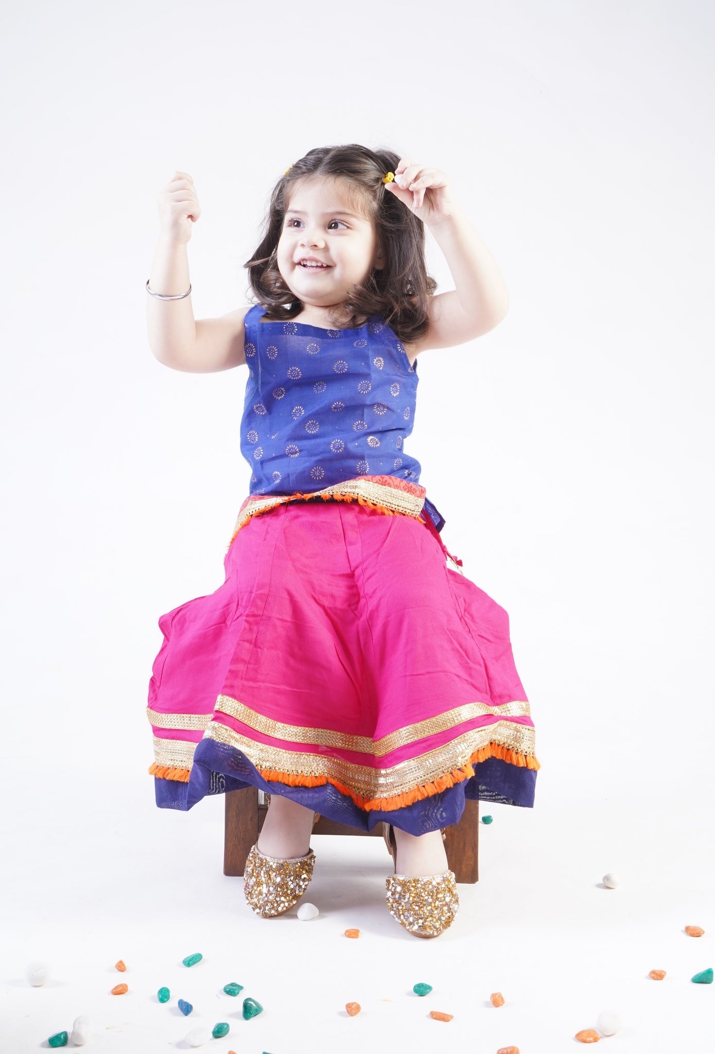 This beautiful pink and blue girls lehenga choli will brighten up your child's day. It  is made of  softest, premium material and will be the cutest little outfit for the upcoming festive season!