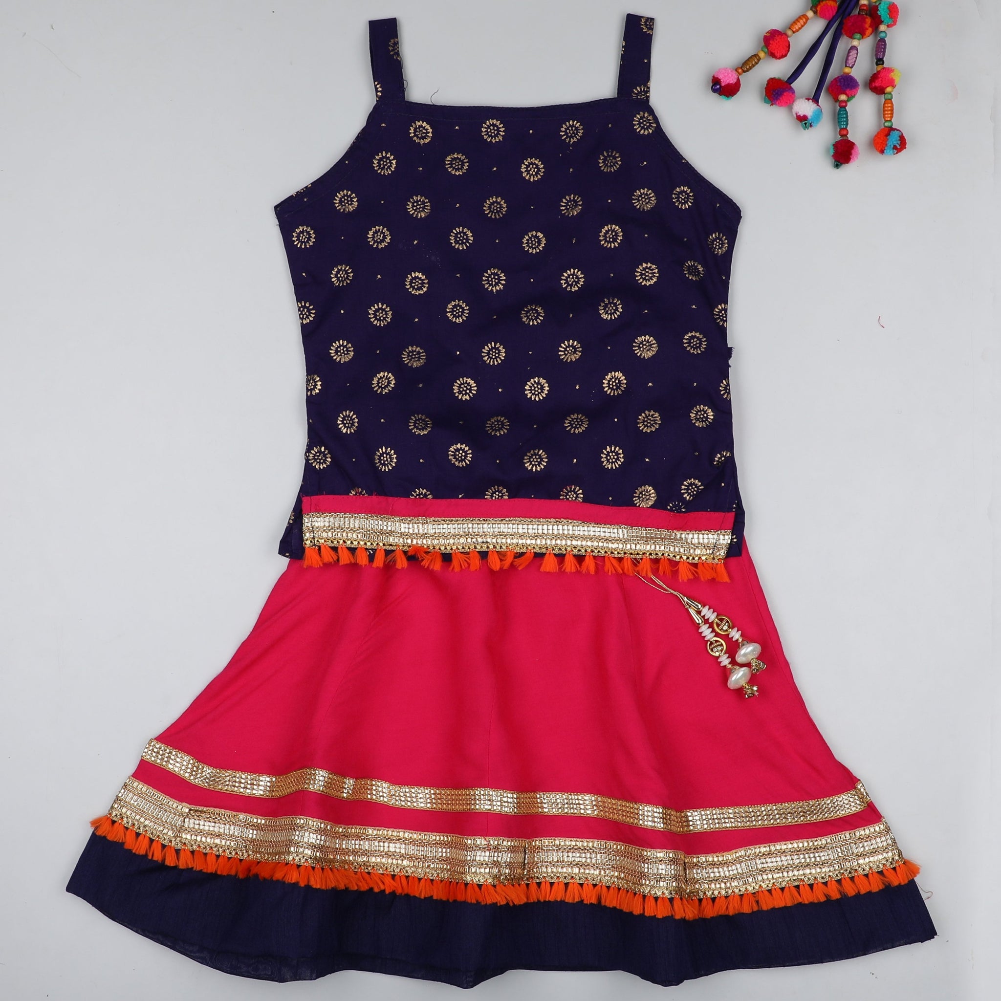 The blue zari print top is 100% cotton along with rayon lehenga skirt with ghera, and is also accompanied with leheriya dupatta!