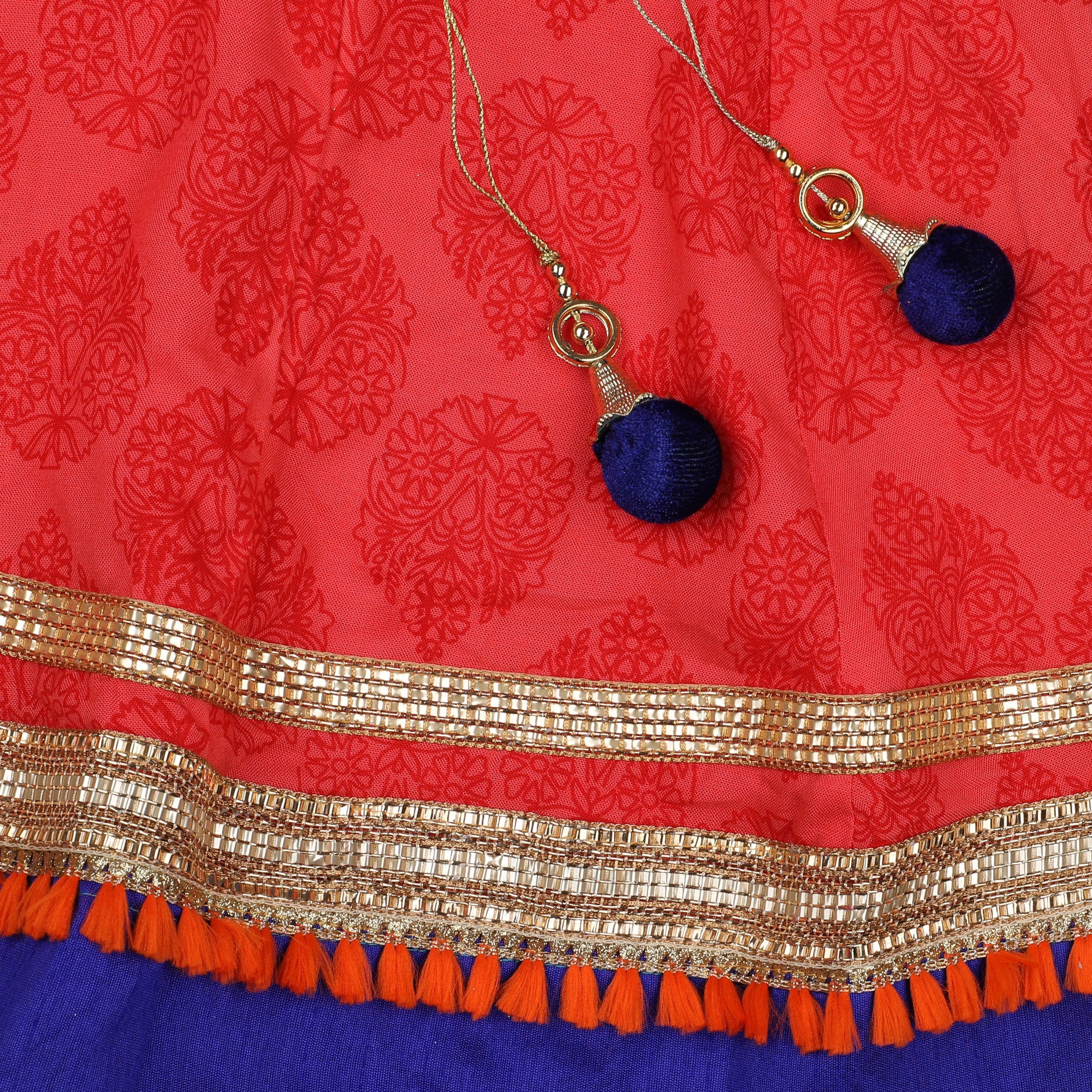 This beautiful red and blue girls lehenga choli will brighten up your child's day. It is made of softest, premium material and will be the cutest little outfit for the upcoming festive season!