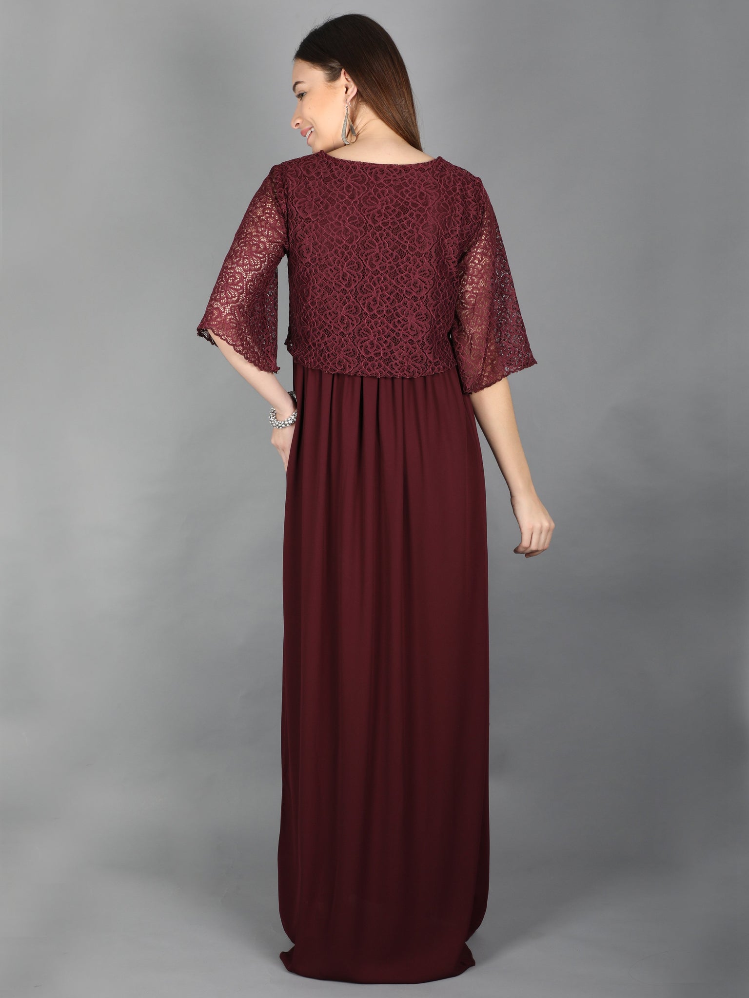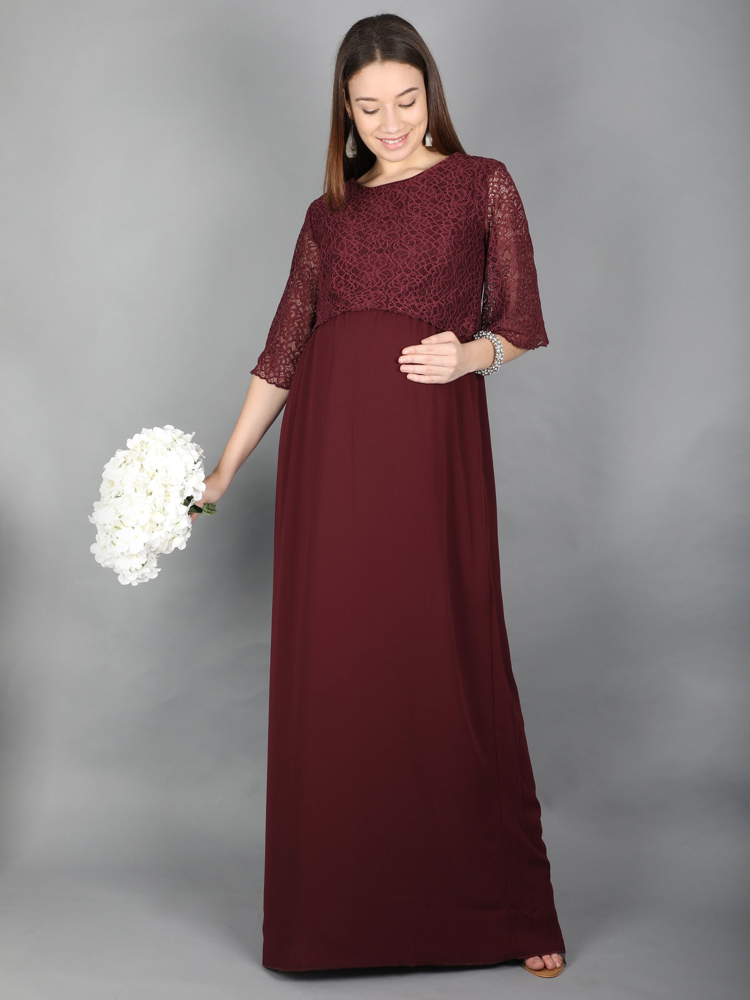 Celebrate your special day with our Ruby Wine Maternity and Nursing Dress. A solid hued soft lace top with lace sleeves is the perfect outfit for your maternity photoshoot or baby shower. The elegance of the dress will enhance your curves while the soft georgette fabric will keep you at ease.This dress features a chic round neckline, and bell sleeves in a see through lace, it has two nursing zippers attached at the princess line for easy access while nursing and knitted lace panel over the bodice gives you confidence to nurse publicly. This Ruby Wine Maternity and Nursing Dress is a must have choice for your wardrobe.