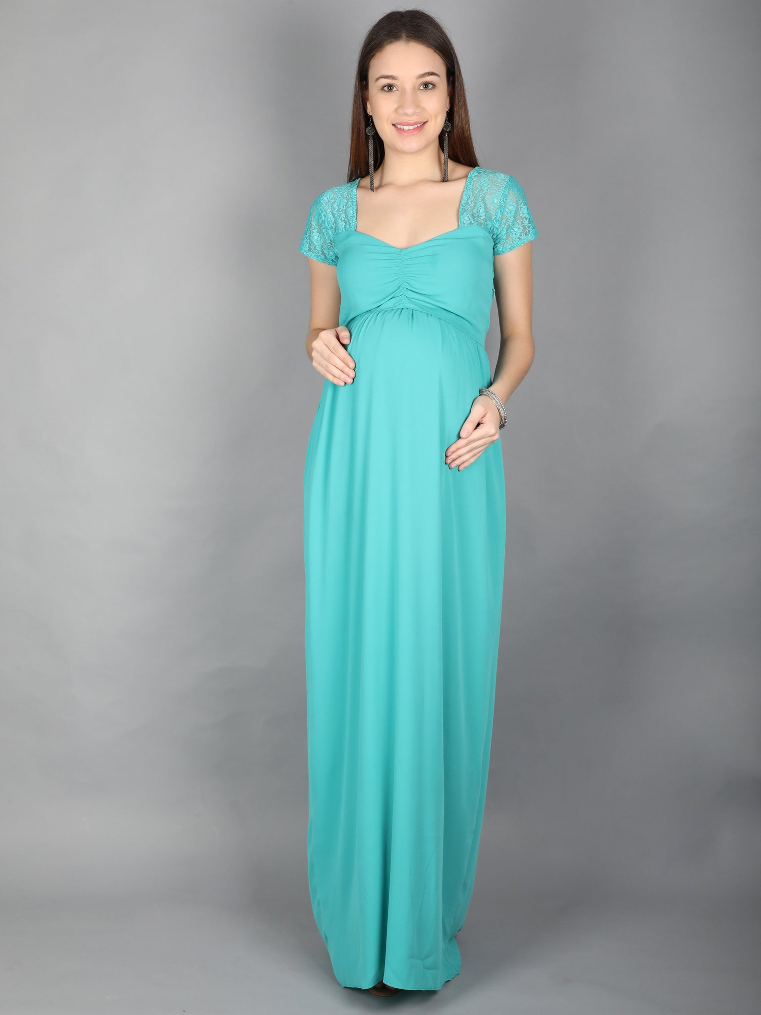 Celebrate your special day with our Teal Blue maternity dress. A solid hued soft lace sleeves is the perfect outfit for your maternity photoshoot or baby shower. The elegance of the dress will enhance your curves while the soft georgette fabric will keep you at ease. This dress features a sweetheart neckline, and sleeves in a see through Lace, combine it with a bra which has transparent straps to enhance the see through lace. This dress is a great choice for your special day.